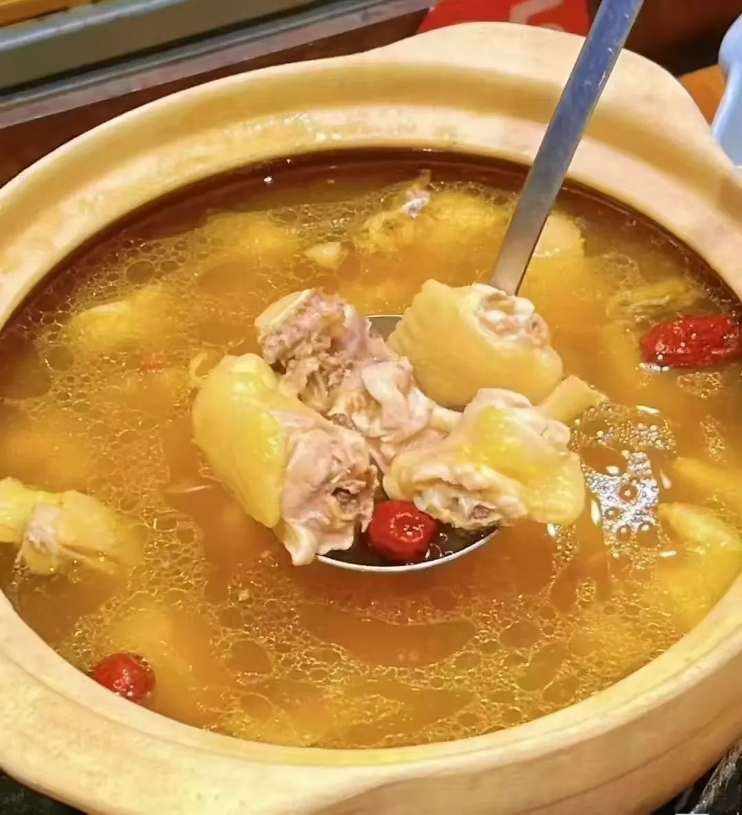 當地人常說:“好湯無需復雜佐料,山與雞的對話就是最好的調味。”開鍋蓋的剎那,金黃油亮的湯面上浮著點點晶潤的雞油,香氣如云霧般升騰,輕啜一口,湯汁清而不寡,鮮味直抵喉頭,雞肉輕輕一抿便脫骨化渣,連骨髓都浸潤著醇香。這道摒棄味精與添加劑的湯肴,用極簡的烹飪哲學,將大自然的饋贈原汁原味地呈現在食客面前。